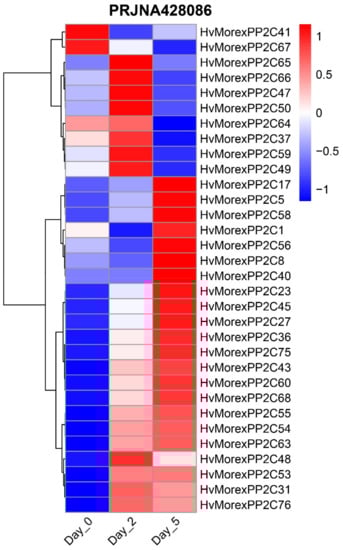 HvPP2Cs are related to developmental processes. A total of 32 HvPP2Cs were expressed at least in one stage during the early stages of barley development (Figure 10, bioproject PRJNA428086). Among them, two genes (HvMorexPP2C41 and HvMorexPP2C67) exhibited specific expression on day 0 of barley growth, eight genes on day 2 and seven genes on day 5. In addition, another RNA-seq result (Figure S3, bioproject PRJNA668924) showed that HvPP2Cs have different expression levels during inflorescence development and may be required for inflorescence indeterminacy and spikelet determinacy.