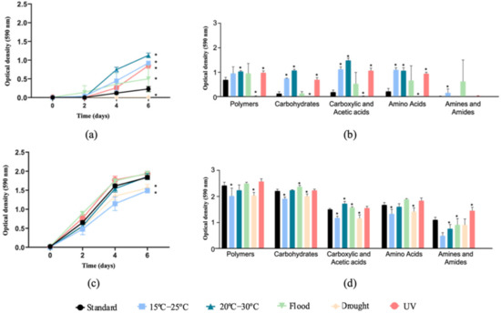 In the soils without E. crypticus, an increase in microbial catabolic activity was observed in relation to the standard conditions after exposure to all the scenarios simulated, except for drought (Figure 1a). The highest substrate consumption rates were found for rising air temperature (300% and 390% increase in AWCD under 15–25 °C and 20–30 °C, respectively) and UV radiation (270% increase in AWCD). Specifically, a higher oxidation of polymers (38%–50%–42%, for the three scenarios mentioned above, respectively), carbohydrates (484%–742%–443%), carboxylic and acetic acids (501%–695%–472%) and amino acids (406%–390%–334%) was observed (Figure 1b). The amine and amide oxidation increased by more than 1000% after exposure to rising air temperatures ranging between 15 °C and 25 °C. Regarding the flood condition, no significant differences were observed in the microbial consumption of the substrates tested after the exposure to this scenario. The opposite effects were observed when the soil was exposed to drought conditions, which led to a decrease in AWCD of 97% compared to the standard conditions (with almost no oxidation of any of the carbon sources tested) (Figure 1a,b).