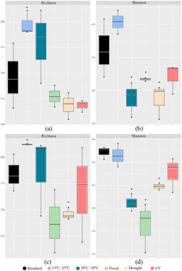 The α diversity measures (richness a,c; and Shannon index b,d) based on 16S rRNA gene profiling of Lufa 2.2 soil without (a,b) and with (c,d) the presence of the soil invertebrate E. crypticus after exposure to each scenario for 48 h. Solid lines within boxes indicate the median value (n = 3). Boxes include data within the 25th and 75th percentiles and whisker lines refer to the 5th and 95th percentiles. Standard refers to the conditions recommended by the standardized OECD guidelines. The symbol * indicates statistical differences compared to standard conditions based on one-way ANOVA followed by Dunnett’s post hoc test (p < 0.05). UV (ultraviolet).