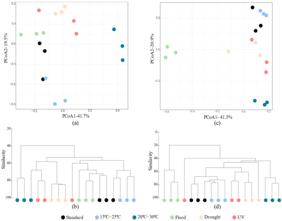 The β diversity measures of Lufa 2.2 soil without (a,b) and with (c,d) the presence of the soil invertebrate E. crypticus after exposure to each scenario for 48 h. Principal coordinate analyses (PCoAs a,c) and dendrograms (b,d) were based on Bray–Curtis similarity matrices of OTUs abundance tables. Standard refers to the conditions recommended by the standardized OECD guidelines. UV (ultraviolet).