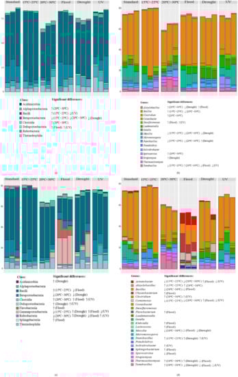 At the genus level, regardless of the absence or presence of the E. crypticus, all the scenarios simulated significantly affected at least one of the 15 most abundant bacterial genera present in the soil (Figure 4b,d). In the soil without the E. crypticus, the exposure to air temperatures ranging between 20 °C and 30 °C led to the strongest shifts in bacterial genera. Compared to the standard conditions, this temperature scenario significantly increased the relative abundances of the Alicyclobacillus, Clostridium, Sporosarcina and Tumebacillus genera, while it decreased those of Bacillus, Massilia and Paenibacillus (Figure 4b). The Clostridium genus was not detected in the soil under standard conditions. Similarly, exposure to soil moisture alterations and UV radiation led to the detection of the Desulfuromonas (flood and UV) and Streptomyces (drought) genera, which were not detected under standard conditions (Figure 4b), in the soil. The Alicyclobacillus, Massilia and Paenibacillus genera, which were present in the soil under standard conditions, were not detected after exposure to drought (Alicyclobacillus and Massilia) and temperatures of 15–25 °C (Paenibacillus) (Figure 4b).