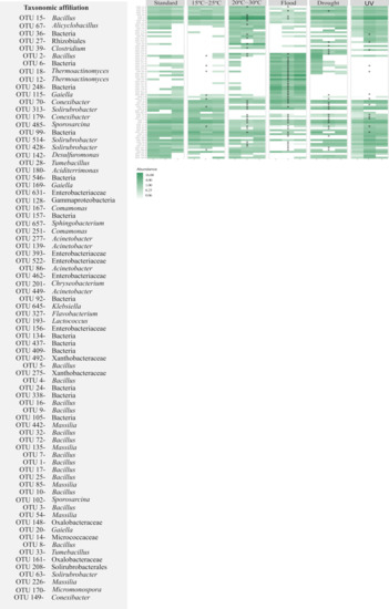 For soil with E. crypticus, the strongest impact resulted after exposure to flood conditions (58% of the top 30 most abundant OTUs affected) (Figure 6). The relative abundance of 60% of the affected OTUs increased after exposure to this scenario. These OTUs belonged to the Acinetobacter, Bacillus, Chryseobacterium, Comamonas, Flavobacterium, Klebsiella, Lactococcus and Sphingobacterium genera. Furthermore, after exposure to flooding, 13% of the affected OTUs were not detected in the soil; they belonged to the Massilia and Tumebacillus genera. For this soil, the exposure to 20–30 °C, drought conditions, UV radiation and temperatures of 15–25 °C affected 36%, 28%, 17% and 10% of the OTUs present in the soil, respectively.