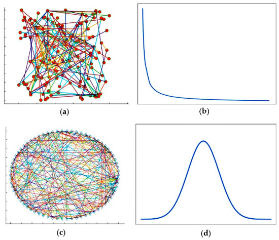 Comparison diagram of the scale-free network and the random network: (a) visualization of the scale-free network; (b) the degree distribution curve of nodes in the scale-free network; (c) visualization of the random network; (d) the degree distribution curve of nodes in the random network.