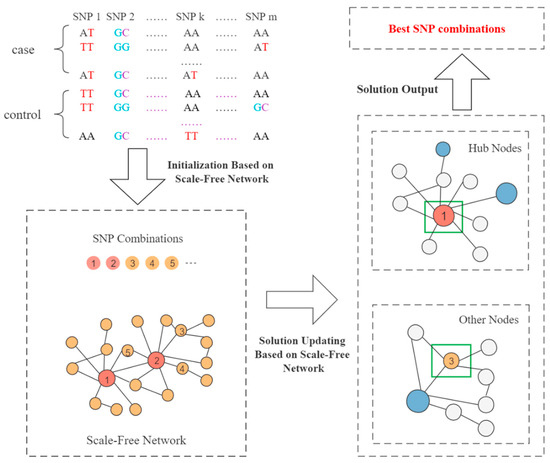 The SFMOABC relies on both the scale-free network and the opposition-based learning strategy to update solutions representing SNP combinations. Both the employed bee and onlooker bee stages of the SFMOABC involve solution updating. The scale-free network is a network model with a power law distribution and a low degree-degree correlation coefficient. Based on these characteristics, low-quality solutions are more likely to move closer to high-quality solutions. Therefore, when the solution is updated, the SFMOABC will find the solution corresponding to its neighbor with the largest degree in the network and then move closer to it. However, the quality of the hub nodes is high. When any two hub nodes are close to each other during the updating process, the SFMOABC can easily fall into the local optimum. Therefore, in order to increase the exploration ability and prevent premature convergence, a solution is randomly selected from the solution space when the hub code is updated.