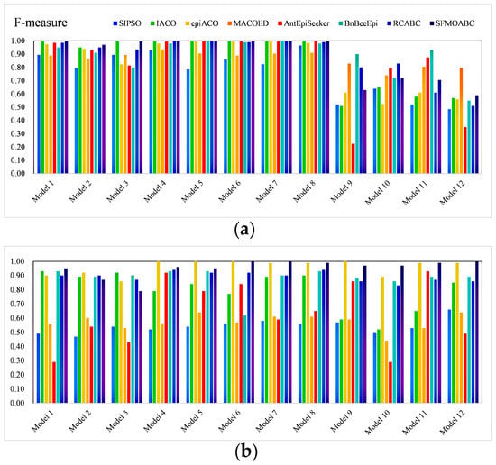 The F-measure results of the eight methods for different models and scales are shown in Figure 5 and Figure 6. Moreover, we compared the running times of these seven methods based on the swarm intelligence algorithm and two single-objective ABC algorithms. We ran these methods independently 30 times on each epistatic model and took the logarithmic form of the average value of 30 independent experiments as the final result [39]. Figure 7 gives the running times of these eight methods.