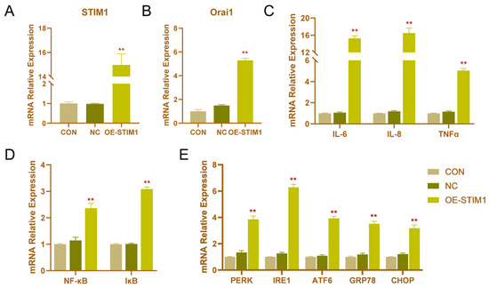 Transfection of STIM1 recombinant plasmid significantly enhanced the expression of STIM1 mRNA in cells (Figure 3). Without LPS stimulation, the overexpression of STIM1 (OE-STIM1) increased the mRNA expression of Orai1. Notably, the expression levels of NF-κB, IκB, IL-6, IL-8, and TNFα increased significantly (p < 0.01), suggesting that the upregulation of STIM1 is closely related to cellular inflammation. Furthermore, OE-STIM1 significantly increased the mRNA expression of PERK, IRE1, ATF6, GRP78, and CHOP (p < 0.01). These results suggested that STIM1 plays a regulatory role in the NF-κB signaling pathway, causing inflammation and ERS in cells.