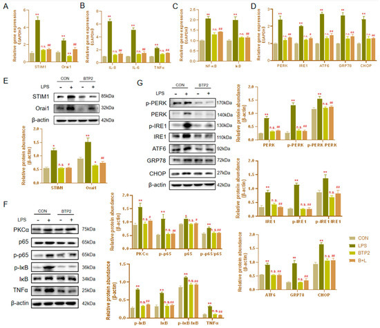 Effects of the Orai1 inhibitor BTP2 on LPS-induced inflammation and endoplasmic reticulum stress (ERS) in BHEC. Treatments: BHEC were cultured in a BTP2-free medium for 24 h. CON, complete control groups; LPS, cells treated with 16 μg/mL LPS for 1 h; BTP2, pretreatment with 8 μg/mL BTP2 for 6 h without LPS treatment; LPS + BTP2, 8 μg/mL BTP2 for 6 h, followed by 16 μg/mL LPS for 1 h. (A–D) Expression levels of STIM1/Orai1 and the genes related to inflammatory cytokines (NF-κB, IκB, IL-6, IL-8, and TNFα) and ERS (PERK, IRE1, ATF6, GRP78, and CHOP) were shown. Gene expression levels were normalized to that of GAPDH. (E–G) Protein abundance levels of STIM1/Orai1, PKCα, p65, p-p65, IκB, p-IκB, TNFα, PERK, p-PERK, IRE1, p-IRE1, ATF6, GRP78, and CHOP in BHEC, showing representative bands of the Western blot analysis and the quantified volume of specific bands. The results are presented as the means ± SEM. * p < 0.05, ** p < 0.01 indicate a significant difference between the LPS groups and the control groups; n.s. indicates that there was no significant difference between the BTP2 group and the CON group. # p < 0.05, ## p < 0.01 indicate a significant difference between the BTP2 pretreatment groups and the LPS groups.