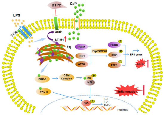 Lipopolysaccharide (LPS) is a common bacterial endotoxin that is normally produced by bacteria in the gastrointestinal tract and enters blood circulation by absorption [18]. LPS can stimulate the immune system and enhance innate immunity at low concentrations, while it causes extensive and intense inflammatory reactions at high concentrations [19,20]. Some studies in the livers of cows have reported that LPS affects the nutrient metabolism of the liver and reduces the immune capacity of animals, and may even cause endotoxemia in serious cases [21,22]. The liver, as the largest digestive organ and immune organ of dairy cows, is one of the main target organs attacked by LPS and plays an important immune role for LPS [22]. Previous studies have shown that LPS binds to receptors on the cell membrane to activate the monocyte-macrophage system inside the liver [23]. LPS induces the release of TNF, IL-6, IL-8, and other inflammatory mediators in the cell through the mitogen-activated protein kinase pathway, the PKC pathway, the NF-κB pathway, and other inflammatory signaling pathways, resulting in inflammatory reactions [21,24]. It has been reported that upregulation of STIM1/Orai1 can promote inflammation and ERS in mammary tissue [21], and this can inhibit the LPS-induced inflammation by regulating ERS in BHEC [20,25]. LPS stimulation could reduce calcium ions in the ER and activate STIM1/Orai1, and thereby conformational activation, resulting in the influx of Ca2+ from the outer membrane and cell damages [21].