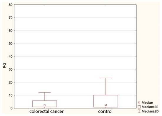 Expression of miR143 in colorectal cancer group and controls. RQ—relative quantification.