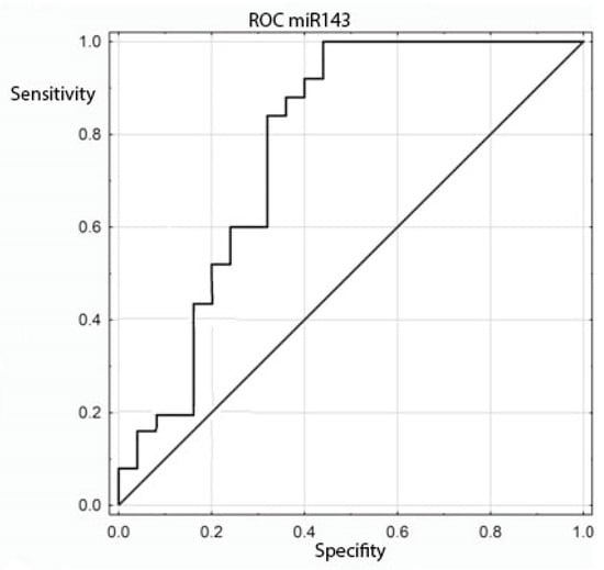 The expression of the miRNA sequences miR-143/miR-145, miR-1, miR-210 and let-7e was also analyzed statistically for correlation with the clinical and histopathological data regarding age, sex, grading, staging and TNM. The study found a statistically significant correlation between the degree of tumor differentiation (grading) and miRNA-143 in the patient group: it was positively correlated with the degree of tumor differentiation (Table 6 and Table 7 and Figure 2). All other above-mentioned correlations proved to be statistically insignificant. ROC curves were constructed to compare colorectal cancer and the positive lymph nodes of colorectal cancer. The results indicated that the absence of miR-143 is characteristic of metastatic tissue derived from the positive lymph nodes of colorectal cancer (Figure 3).