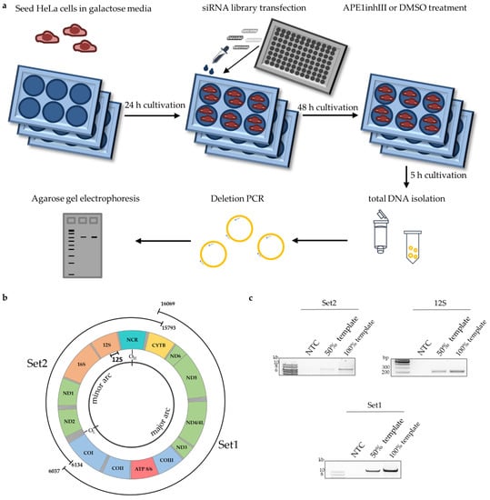 For screening, HeLa cells were seeded in a 6-well plate in galactose instead of glucose medium, as galactose medium more closely mimics the physiological situation than cultivation in high-glucose medium. Galactose channels energy production from glycolysis to OXPHOS, leading to elevated endogenous ROS levels in the cells [,]. This aspect was critical to unveiling the role of ENDOG in mtDNA cleavage in our previous study []. For knockdown, cells were transfected with gene-specific siRNA pools (4 siRNAs each), cultured for 48 h, and afterwards treated for 5 h with DMSO or APE1 inhibitor III (APE1inhIII). APE1 is central to the main repair pathway in mitochondria, namely BER []. Finally, total DNA was isolated, and a pre-established long-range PCR was performed (Figure 1b) []. To ensure that the mtDNA was amplified in the linear range of the PCR, we performed a 50% template control along with a 100% template control in each experiment (Figure 1c). For screening factors involved in mtDNA maintenance, we amplified the Set2 region of the mitochondrial genome (long fragment) and normalized it to a short fragment within the 12S gene, for assessment of the amount of fully synthesized mtDNA.