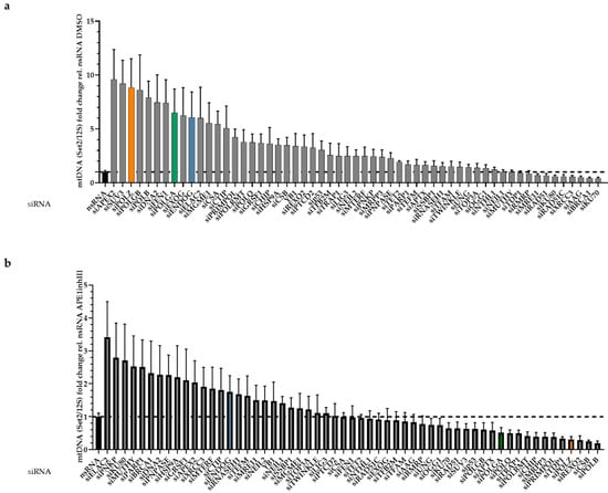 Following PCR amplification, mtDNA band intensities were densitometrically quantified, and the results obtained after 4 screening rounds, i.e., results from 4 independent experiments, were depicted in a waterfall plot. For reasons of clarity, protein names were used throughout this manuscript although siRNAs target mRNAs of genes. The respective gene names are listed in Supplementary Table S1. The knockdown of most of the factors led to increased levels of Set2 mtDNA (Figure 2a). In the presence of APE1inhIII, i.e., under conditions of BER inhibition, simultaneous knockdown of the majority of proteins led to a decrease in the Set2 mtDNA level (Figure 2b).