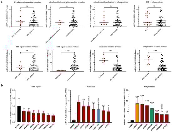 To obtain better insight into the results of the siRNA screening, the investigated proteins were grouped according to the pathway in which they are involved and/or their biochemical functions, and compared to all other investigated proteins. Of note, the average values obtained for the group of DSB repair proteins were remarkably lower than the other proteins, whereas they were higher for the groups of polymerases and nucleases (Figure 3a). For all other functional groups, no significant differences were observed. To further delineate the impact of individual proteins in the three groups with identified differences in Set2 mtDNA content, the mean values obtained after knockdown of single members of these groups were compared to the respective nsRNA control. Knockdown of none of the DSB repair proteins caused a significantly different Set2 mtDNA level (Figure 3b, left panel). Conversely, and as expected for the group of nucleases, which are known to attack the integrity of mtDNA, Set2 levels significantly rose or showed this trend (p < 0.1) upon knockdown of 6 out of 7 tested candidates, namely DNA2, FEN1, EXOG, ENDOG, MGME1, and CTIP (Figure 3b, middle panel). Unexpectedly, a significant increase in Set2 mtDNA levels was also seen upon knockdown of 6 out of 7 polymerases or polymerase subunits. The only exception was the mitochondrial RNA polymerase (POLRMT) (p = 0.0650), suggesting that the loss of DNA polymerases protects Set2 mtDNA (Figure 3b, right panel). Both subunits of polymerase γ (POLG), which is the replicative polymerase in mitochondria, were hits of this group. Of interest, POLGA, the catalytic subunit of POLG, also increases the lifetime of error-containing mtDNA []. The activity of the 3′-5′ exonuclease [] is necessary for the degradation of mtDNA fragments []. Downregulation of POLGA may therefore increase the lifetime of error-containing mtDNA [].
