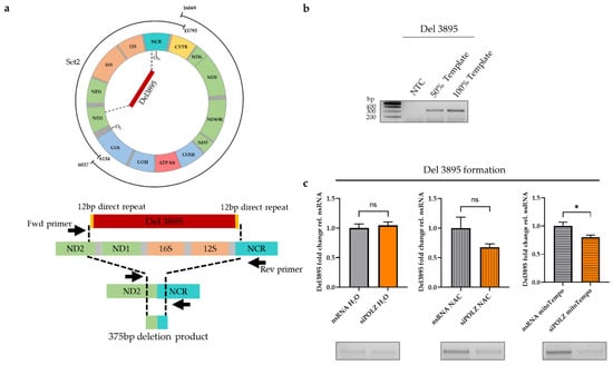 POLZ is involved in the Del3895 formation. Schematic presentation of the location of 3895 bp deletion (upper) and the location of primers for amplification of 375 bp generated by the 3895 bp deletion (lower) (a). Representative agarose gels of 375 bp deletion product confirming analysis in the linear range of PCR (50% template and 100% template) (b) and quantification of Del3895 deletion product from HeLa cells cultured in galactose medium, siRNA-mediated knockdown for 48 h plus 24 h treatment with 100 µM mitoTempo or 2 mM NAC (n = 10 from 5 independent experiments) (c). Representative agarose gels are shown below the graphs. All values are means ± SEM (* p ≤ 0.05); ns, not significant.