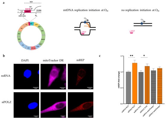 POLZ knockdown leads to compensatory mtDNA replication initiation under conditions of oxidative stress. Scheme of mREP recognition site in mitochondrial genome (left, []) and mREP recognition of open DNA replication bubble when replication initiation occurs at OH (right, []) (a). Representative confocal microscopic images of the mREP fluorescence signal of HeLa cells cultured in galactose media and siRNA-mediated knockdown for 48 h, scale bar = 10 µM (b). DAPI is used as a reference for the nuclear and extra-nuclear surface (mitochondria located over the nuclear surface may also be mREP-positive), and mitoTracker DR was used as a mitochondrial marker. Fluorescence-based quantification of mREP signal, n = 35–42 cells from 2 independent experiments, cultured in galactose medium, siRNA-mediated knockdown of POLZ for 48 h versus nsRNA control plus treatment with H2O, or 2 mM NAC or 100 µM mitoTempo for 24 h (c). All values are means ± SEM (* p ≤ 0.05, ** p ≤ 0.01).