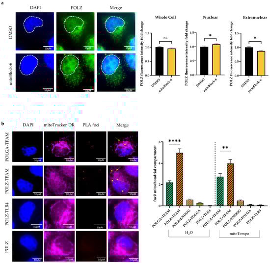 Since there is still a debate on whether POLZ localizes to mitochondria [] and only a few publications provide evidence for mitochondrial localization of POLZ [,], we aimed to further substantiate this aspect. Therefore, we quantified POLZ-specific signals in HeLa cells by immunofluorescence microscopy (Figure 7a). POLZ fluorescent signals were detectable in the nucleus as well as in extra-nuclear regions, showing intense punctate staining suggestive of localization in mitochondria. This notion was strengthened by co-staining with the mitochondrial marker TOM22 (Supplementary Figure S5). Next, we treated cells with a mitochondrial import inhibitor (mitoBlock-6) to reduce the import of proteins into the mitochondria. After mitoBlock-6 treatment, the overall POLZ intensity remained the same, whereas the signal in the nucleus increased in contrast to the extranuclear signal, which decreased (Figure 7a, right panel). These results support the concept that a fraction of the nuclear encoded POLZ protein is transported into mitochondria. As another method to sustain the evidence of mitochondrial POLZ localization, we performed a proximity ligation assay (PLA) to show the close proximity of POLZ to a well-established mitochondrial protein. As a positive control, we examined the localization of POLGA adjacent to TFAM, both well described mitochondrial matrix proteins [,], and found formation of distinct PLA foci, as expected (Figure 7b). As a negative control, PLA for POLZ and the membrane receptor TLR4 was performed, and indeed no PLA foci were detected. Interestingly, PLA foci were observed for POLZ and TFAM (Figure 7b). POLZ-TFAM-specific PLA foci numbers were higher than for POLGA and TFAM, strongly supporting mitochondrial localization of POLZ. We also observed a close proximity of POLZ to ENDOG and POLGA, although to a much lesser extent than to TFAM. The formation of POLZ-TFAM-specific PLA foci showed a decrease when the cells were treated with mitoTempo, indicating a more pronounced mitochondrial localization of POLZ under conditions of oxidative stress. However, this trend can be explained by lower POLZ protein levels under mitoTempo treatment (Supplementary Figure S6a,b), which we also observed in cells cultivated in glucose versus galactose medium (Supplementary Figure S6c,d). In Figure 7b punctate POLZ-specific signals outside the nucleus colocalized with mitoTracker DR staining, further supporting mitochondrial localization of this polymerase. We also noticed that POLZ knockdown led to a significant decrease (0.7-fold, p ≤ 0.0001) of TOM22 fluorescence intensity, suggesting a reduction in mitochondrial mass after POLZ depletion (Supplementary Figure S7). Taken together, the results obtained using different experimental approaches provide evidence for a localization of a fraction of POLZ in mitochondria and support the notion that POLZ plays a role in mtDNA maintenance under conditions of high as well as low oxidative stress.