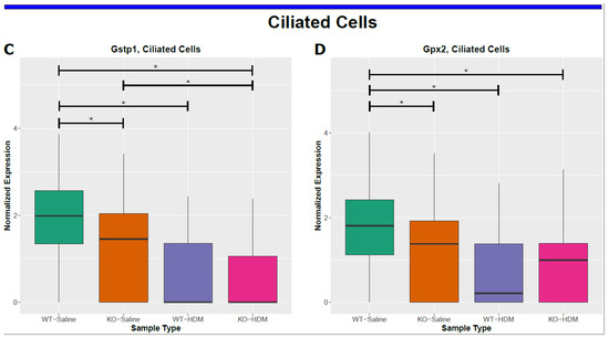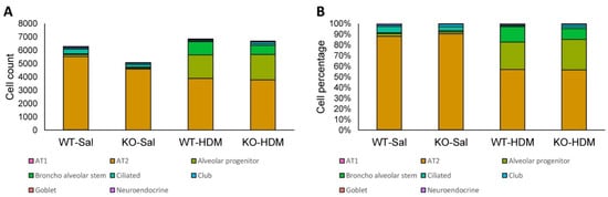 We used the FindClusters function from Seurat to cluster the cells, using a wide range of resolutions, from 0.01 to 2, to identify the best resolution for our dataset. FindClusters is a shared nearest-neighbor modularity optimization-based clustering algorithm. Our eventual selection was a resolution of 1, yielding 11 initial cell clusters. We then used markers from the single-cell mouse cell atlas [18] and another study on lung epithelial cells [19] to identify cell clusters. For each cluster, we plotted the gene expression levels of the markers from each epithelial cell type in our references, and identified which cell type was represented by each cluster. We merged some of the original 11 clusters identified by Seurat [14] that expressed similar markers, only merging sister nodes in the cell cluster tree generated by BuildClusterTree from Seurat. After merging similar clusters, we had a total of nine different labeled cell clusters in our dataset. We then used Seurat to calculate cluster means and perform differential expression analyses via the Wilcoxon rank sum test. For each individual cell type, as well as for all cells combined, we performed five differential expression comparisons: (1) WT-HDM vs. WT-Saline (WT-Sal), (2) KO-Saline (KO-Sal) vs. WT-Sal, (3) KO-HDM vs. KO-Sal, (4) KO-HDM vs. WT-HDM, and (5) KO-HDM vs. WT-Sal. Differentially expressed genes (DEGs) had a false discovery rate (FDR) of 0.05 or less, and a fold change of at least 1.2. DEGs also had to be expressed in at least ten percent of one of the comparison groups to qualify as differentially expressed. Pathway enrichment analyses for DEGs from each comparison were performed using IPA (QIAGEN Inc. Germantown, MD, USA, https://digitalinsights.qiagen.com/products-overview/discovery-insights-portfolio/analysis-and-visualization/qiagen-ipa/) (accessed between 1 March 2021 and 1 April 2022).