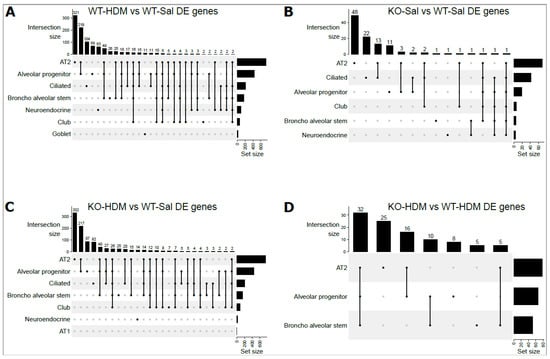 UpSet plots for overlapped DEGs among 8 individual cells types: (A) WT-Sal vs. WT-HDM; (B) WT-Sal vs. KO-Sal; (C) KO-HDM vs. WT-Sal; (D) KO-HDM vs. WT-HDM. Dots below vertical bars represent overlapping DEGs among different cell types. Horizontal bars represent the total number of DEGs in each cell type.