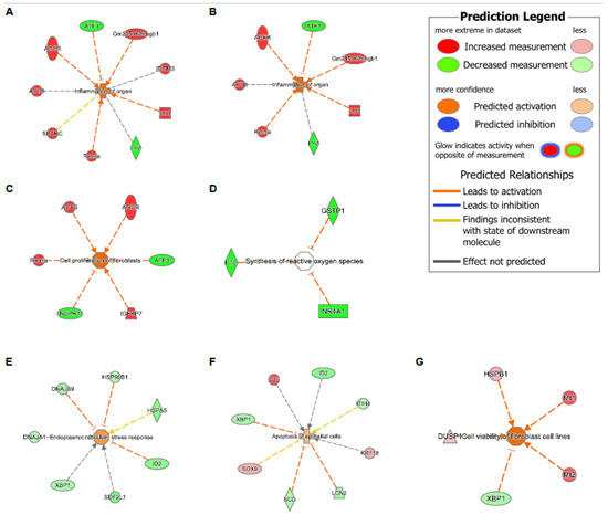 Diseases and function analysis in EpCAM+, AT2, and ciliated cells via IPA. (A-D) DEGs with consistent direction changes among 3 comparisons (WT-HDM vs. WT-Sal, KO-Sal vs. WT-Sal, and KO-HDM vs. WT-Sal). (A) Inflammation of organ in EpCAM+ cells (z = 1.866, overlapping p = 7.54 × 10−4). (B) Inflammation of organ in AT2 cells (z = 2.097, p = 2.93 × 10−3). (C) Cell viability of fibroblast in AT2 cells (z = 2.408, p = 3.51 × 10−6). (D) Synthesis of reactive oxygen species in ciliated cells (p = 3.54 × 10−4). (E) Endoplasmic reticulum stress response (z = 1.015, p = 6.74 × 10−6), (F) apoptosis of epithelial cells (z = 0.651, p = 6.85 × 10−5), and (G) cell viability of fibroblast cell lines (z = 2.236, p = 1.41 × 10−4) in DEGs in KO-HDM vs. WT-HDM in AT2 cells.