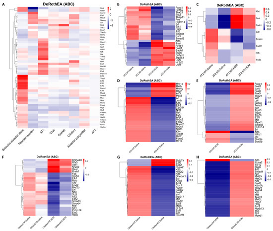 Heatmaps of transcription factor (TFs) activities analyzed using DoRothEA. (A) Top 50 most variable TFs by gene activity across 8 individual cell types. (B) Top 25 TFs across all AT2 cells. (C) TFs that were in the top 25 in both the KO-HDM vs. WT-HDM and KO-Saline vs. WT-Saline comparisons in AT2 cells. (D) Top 25 TFs in the KO-Saline vs. WT-Saline comparison that were not in the top 25 for KO-HDM vs. WT-HDM in AT2 cells. (E) Top 25 TFs in the KO-HDM vs. WT-HDM comparison that were not in the top 25 for KO-Saline vs. WT-Saline in AT2 cells. (F) Top 25 most-variable TFs in ciliated cells. (G) Top 25 most-variable TFs in ciliated cells in KO-Saline vs. WT-Saline. (H) Top 25 most-variable TFs in ciliated cells in KO-HDM vs. WT-HDM.