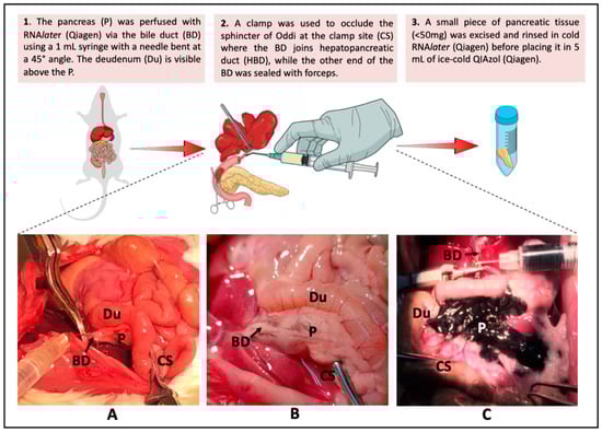 - Mullin, A.E.; Soukatcheva, G.; Verchere, C.B.; Chantler, J.K. Application of In Situ Ductal Perfusion to Facilitate Isolation of High-Quality RNA from Mouse Pancreas. Biotechniques 2006, 40, 617–621. [Google Scholar] [CrossRef] [PubMed]