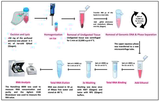 Initially, pancreatic RNA was extracted using the TriPure isolation reagent (Roche, Basel, Switzerland). RNeasy Mini Kit (Qiagen, Hilden, Germany) was also used following the manufacturer’s instructions and with modifications to improve RNA quality. The tissue was rapidly homogenized using a TissueRuptor Ultra-Turrax T8 (IKA laboratories, Staufen, Germany) for 30–60 s on ice, pausing for a few seconds every 20 s to avoid heating, until the lysate was uniformly homogeneous. An additional centrifugation step was performed for 1 min at 12,000× g at 4 °C to remove any unhomogenized lysate, as previously described [8]. This step replaced another step in the standard protocol in which the homogenate was incubated at room temperature (between 21–22 °C) for 5 min. The quick removal of undigested tissue at low temperature is critical to reduce any possible source of RNase contamination that could cause RNA degradation. The upper transparent aqueous layer was removed using a pipette and transferred to a sterilized microcentrifuge tube following the manufacturer’s instructions for genomic DNA elimination. This was followed by addition of chloroform to the samples, which were then centrifuged for 15 min at 12,000× g at 4 °C to separate the upper aqueous phase (~500 µL) containing the RNA. Then, the aqueous phase was transferred to a sterile microcentrifuge tube, and an equal volume of 70% ethanol was added to it prior to being transferred to an RNeasy spin column. The addition of 70% ethanol provides ideal binding conditions for the silica membrane of the spin column. Following two centrifugations (≥8000× g at 15 °C) for 15 s to remove the ethanol, the column was washed once with 700 µL RWT washing buffer (Qiagen) and twice with 500 µL RPE washing buffer (Qiagen). During each wash, the spin column was centrifuged at ≥8000× g at 15 °C, and the flow-through was discarded. Afterward, the column was centrifuged at 16,000× g for 1 min at 15 °C to eliminate any buffer or ethanol carryover. Total RNA was eluted in RNase-free water and stored at −80 °C until future use. All steps and modifications are summarized in Figure 2.
