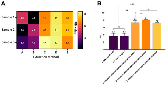 Comparison of RNA integrity number (RIN) values of pancreatic RNA samples from healthy rats following different excision techniques and extraction protocols demonstrated as (A) a heat map with the three RIN values of each protocol reported inside boxes and (B) a bar graph showing the significant difference in RNA integrity between the optimized and standard protocols using the standard one-way analysis of variance (ANOVA) for RNA analysis followed by Fisher’s LSD test. ns, non-significant (p > 0.05) or significant at ** p < 0.01, *** p < 0.001.