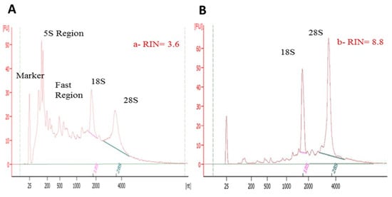 The integrity and quality of RNA measurements are presented as mean ± standard error of the mean (SEM). The data of the different groups, samples, and protocols were compared using one-way analysis of variance (ANOVA) for RNA analysis followed by Fisher’s LSD test using GraphPad Prism version 9.2.0.332. Differences among readings were considered significant at p < 0.05.