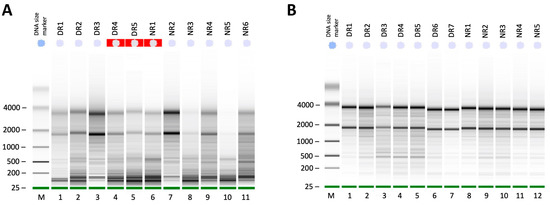 Virtual gel-like images generated by an Agilent 2100 Bioanalyzer using the pico and nano kits. (A) There was a high level of RNA degradation in samples extracted using the standard RNeasy mini protocol (Qiagen). Samples isolated from diabetic rats (DR) are presented in lanes 1–3, which had an RIN range from 4.2–7, while those from normal rats (NR) in lanes 7–11 had an RIN value between 2.3–7.3. Red highlighted lanes 4–6 show samples with low RIN values that could not be calculated due to degradation or sample contamination. (B) Intact RNA with very low levels of degradation in samples extracted using our optimized method. Samples isolated from diabetic rats (DR) are presented in lanes 1–7, which had an RIN value range from 6.7–8.8, while those from normal rats (NR) in lanes 8–12 had an RIN value ≥8.0 except for NR2 and NR3 (RIN = 7.4, 7.2), which was due to a technical difficulty during the homogenization step.