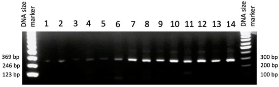 Agarose gel electrophoresis of β-actin amplicons (289 bp) produced from cDNA that was synthesized from RNA extracted from rat pancreas isolates. RNA was extracted from the pancreas of normal rats using the standard RNeasy Mini Kit protocol (Qiagen) (lanes 1–3); RNAlater (Qiagen) injection without clamping and treatment with 5 mL QIAzol (Qiagen) (lanes 4 and 5); clamping and RNAlater (Qiagen) injection followed by the optimized protocol with 7 mL QIAzol (Qiagen) (lanes 6 and 7). As a positive control, RNA was extracted from rat liver using the standard protocol (lane 8). β-actin was also amplified from cDNA that was synthesized from RNA isolated from pancreas of diabetic rats using clamping and RNAlater (Qiagen) injection followed by the optimized protocols with 5 mL QIAzol (Qiagen) (lanes 9–11), or from that of normal rat pancreas samples after clamping and RNAlater (Qiagen) injection using the optimized protocol with 5 mL QIAzol (Qiagen) (lanes 12–14). A 100-bp DNA size marker (Agilent Technologies, Santa Clara, CA, USA) and a 123-bp DNA ladder (left) were used as references.
