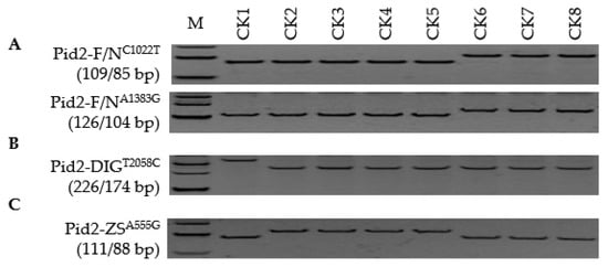 Development of a comprehensive FNP marker system able to distinguish both haplotypes and alleles of Pid2: (A–C) Discriminating between functional (F) and non-functional (N) haplotypes and between Pid2-DIG and Pid2-ZS alleles. CK1, Digu (Pid2-DIG); CK2, Tetep (Pid2-ZS); CK3, CO39 (Pid2-ZS); CK4, Zhenshan 97 (Pid2-ZS); CK5, Tadukan (Pid2-ZS); CK6, Nipponbare (Pid2-Null); CK7, Koshihikari (Pid2-Null); CK8, Shennong 265 (Pid2-Null). C1022T in superscript represents the FNP at the 1022 position of Pid2, C represents target, T non-target, and M the DL-500 size marker.