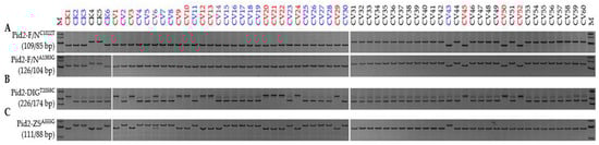 Alleles of Pid2 represented in the regular panel consisting of both Xian (CV1-30) and Geng (CV31-60) types: (A) Functional and non-functional haplotypes; (B) Pid2-DIG allele; and (C) the Pid2-ZS allele. CK1, Digu (Pid2-DIG; red); CK2, Tetep (Pid2-ZS; blue); CK3, Zhenshan 97 (Pid2-ZS; blue); CK4, Nipponbare (Pid2-Null; black); CK5, Shennong 265 (Pid2-Null; black); CK6, CO39 (Pid2-ZS; blue); the undefined alleles carried by CV6 and CV14 are marked in purple. Detailed information on each entry is shown in Table S2. M represents the DL-500 size marker.