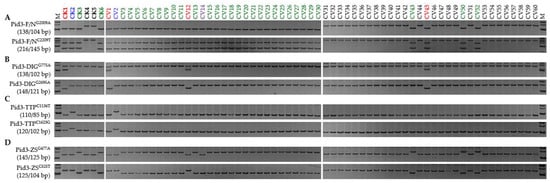 The DNA sequences of Pid2 (FJ915121.1), Pid3 (FJ745364.1), and Pid4 (MG839283.1) present in Digu as well as in a number of reference cultivars were retrieved from GenBank (http://www.ncbi.nlm.nih.gov/, accessed on 12 September 2020), and each set of alleles was aligned using Multalin (http://multalin.toulouse.inra.fr/multalin/, accessed on 13 September 2020). A comprehensive FNP marker system consisting of two sets of FNP markers, one for functional/non-functional haplotypes and another for individual alleles, was developed for deeper allele mining of each member of the Pid family. An interval sequence of each candidate FNP was subjected to various marker designations, including CAPS (cleaved amplified polymorphism sequences), and dCAPS (derived CAPS), using dCAPS Finder 2.0 (http://helix.wustl.edu/dcaps/dcaps.html, accessed on 28 September 2020). The necessary primer sequences were generated using Primer3 software (https://primer3.ut.ee, accessed on 28 September 2020). For sequencing largely diverged intervals, PCR was driven by triple and/or degenerate primers (Table S1) [,].