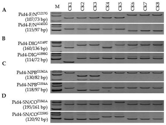 Development of a comprehensive FNP marker system able to distinguish both haplotypes and alleles of Pid4: (A–D) Discriminating between functional (F) and non-functional (N) haplotypes and among Pid4-DIG, Pid4-NPB, Pid4-CO, and Pid4-SN alleles. CK1, Digu (Pid4-DIG); CK2, Nipponbare (Pid4-NPB); CK3, Koshihikari (Pid4-NPB); CK4, CO39 (Pid4-CO); CK5, Shennong 265 (Pid4-SN); CK6, Tadukan (Pid4-Null); CK7, Tetep (Pid4-Null); CK8, Zhenshan 97 (Pid4-Null). M represents the DL-500 size marker.