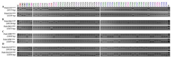 The FNP assays were validated by testing a larger set of control cvs (called CKs), namely, Digu (DIG), Tetep (TTP), CO39, Zhenshan 97 (ZS97), Tadukan (TDK), Nipponbare (NPB), Koshihikari (KSH), and Shennong 265 (SN265). Each 20 µL PCR mixture contained 0.1 µL 5 U/µL rTaqase (TaKaRa, Dalian, China), 2.0 µL 10× rTaq Mg2+ plus buffer, 0.5 µL 10 mM dNTP (TaKaRa), 1.0 µL 2.5 µM primers (Sangon Biotech, Guangzhou, China), 1.0 µL 100 ng/µL template DNA, and 14.4 µL ddH2O. The PCR regime was initiated with a denaturing step (94 °C/3 min), which was followed by 35 cycles of 94 °C/30 s, 50–62 °C/30 s, 72 °C/25–30 s and completed with a 72 °C/5 min final extension. The resulting amplicons were digested for 3 h with the appropriate restriction enzyme (NEB Inc., Ipswich, MA, USA) at the recommended temperature in a 10 µL reaction containing 1.5 µL PCR product, 0.2 µL 3 U/µL enzyme, 1.0 µL 10× digestion buffer, and 8.3 µL ddH2O. The digested amplicons were electrophoretically separated through 10–12% polyacrylamide gels in the presence of Tris-boric acid–EDTA buffer and run at 250 V for 20–50 min, depending on the sizes of the PCR products.