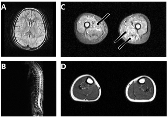 Due to a progressive proximal weakness accompanied by difficulties in rising from the floor, a diagnostic workup was performed at the age of 7 years, including magnetic resonance imaging (MRI) of the brain and of the spinal cord indicating normal results (Figure 1A,B). Edematous alterations were identified in musculus vastus medius, lateralis, and intermedius (black arrows in Figure 1C) but no fatty degenerations were detected. An MRI of the lower legs revealed no pathological alterations (Figure 1D).