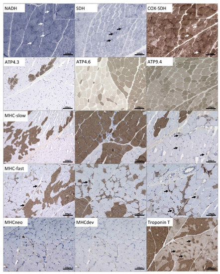 Nicotinamide adenine dehydrogenase trichrome (NADH-TR) staining revealed mild subsarcolemmal accumulation of substrate in a proportion of muscle fibers (Figure 3). The same finding was obtained by succinate dehydrogenase (SDH) stain and combined cytochrome oxidase and succinate dehydrogenase (COX-SDH) stains (Figure 3). Adenosine triphosphatase (ATPase) staining (pH 4.3—not stained = type II/dark = type I, pH 4.6—sub-typing type IIa = pale and IIb = intermediate, dark = type I, pH 9.4—pale type I/dark type II) indicated fiber-type grouping in addition to small fibers of either fiber type (Figure 3), as known pathological hallmarks of denervated muscle. Immunohistochemical studies revealed irregular Troponin-T distribution (Figure 3). Myosin heavy chain fast (MHCf) (demonstrating dark type II fibers, and conversely Myosin heavy chain slow (MHCs) demonstrating dark type I fibers illustrate both the grouping and small, often scattered or also grouped, atrophic fibers of either fiber type. Immature MHC developmental or MHC neonatal-positive fibers were apparent only scarcely.