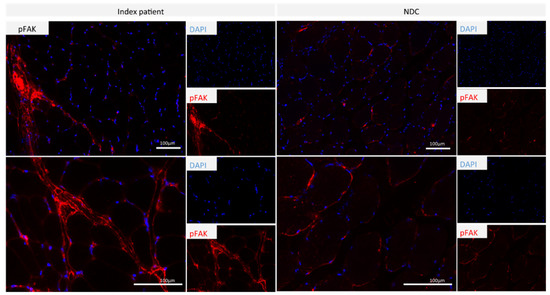 The immunofluorescence-based analysis of phospho-FAK1 on the quadricep muscle was carried out to confirm our proteomic findings, disclosing this protein as being the most increased one in patient-derived lymphoblastoid cells. In skeletal muscle, we detected expression in NDC on muscle fibers, physiological for focal adhesion. In the biopsy derived from the patient, phosphor-FAK1 was increased in perimysial areas along with increased abundance in immune cells (Figure 5).