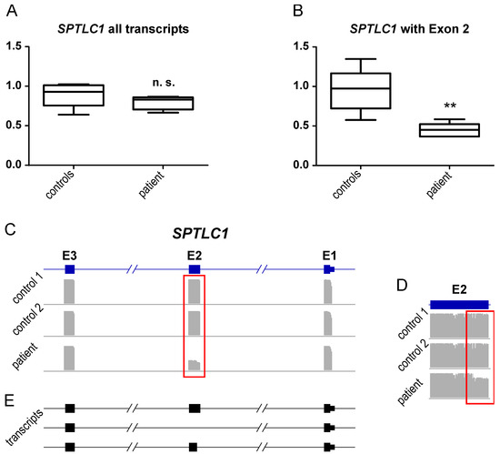 SPTLC1 expression in lymphocytes: RNA was extracted from immortalized lymphocytes derived from the patient and healthy controls. cDNA was generated with random hexamer primers to perform expression analysis of SPTLC1. mRNA expression was calculated via ∆∆Ct method using B2M for normalization. The SPTLC1 expression was normalized to the healthy controls. Boxes indicate the lower and upper interquartiles, horizontal lines indicate the median, and whiskers indicate the minimum-to-maximum values. ** p < 0.01, n. s. not significant, by Mann–Whitney test. (A) SPTLC1 expression of all transcripts. (B) SPTLC1 expression of transcripts containing exon 2. cDNA from healthy controls and the patient were amplified and used for ligation-based nanopore library preparation and sequencing. IGV coverage plots of SPTLC1 exons 1–3 (C) or exon 2 (D), respectively. (E) Compositions of the different SPTLC1 transcript detected by nanopore sequencing in the patient.