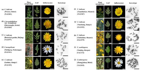 - Wang, Y.; Jung, J.A.; Kim, W.H.; Lim, K.B.; Hwang, Y.J. Morphological and rDNA fluorescence in situ hybridization analyses of Chrysanthemum cultivars from Korea. Hortic. Environ. Biotechnol. 2021, 62, 917–925. [Google Scholar] [CrossRef]