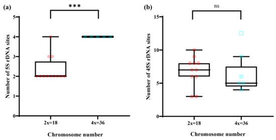 - Su, D.; Chen, L.; Sun, J.; Zhang, L.; Gao, R.; Li, Q.; Han, Y.; Li, Z. Comparative chromosomal localization of 45S and 5S rDNA sites in 76 purple-fleshed sweet potato cultivars. Plants 2020, 9, 865. [Google Scholar] [CrossRef]