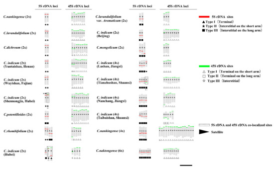 - Qi, X.Y.; Zhang, F.; Guan, Z.Y.; Wang, H.B.; Jiang, J.F.; Chen, S.M.; Chen, F.D. Localization of 45S and 5S rDNA sites and karyotype of Chrysanthemum and its related genera by fluorescent in situ hybridization. Biochem. Syst. Ecol. 2015, 62, 164–172. [Google Scholar] [CrossRef]