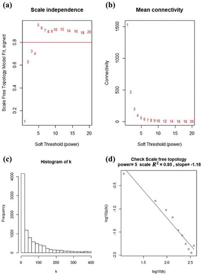 Determination of soft thresholding power in WGCNA. (a) Analysis of the scale-free fit index for various soft thresholding powers β. (b) Analysis of the mean connectivity for various soft thresholding powers. (c) Histogram of connectivity distribution when β = 5. (d) Checking the scale free topology when β = 5.