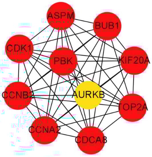Among 147 candidate module genes, the PPI network was constructed with 145 nodes and 2205 edges using the STRING database, and visualized using Cytoscape software (Figure 7). Using the MCC algorithm of CtyoHubba plugin in Cytoscape, the co-expression network of the top ten highest-scored genes, including PDZ Binding Kinase (PBK), DNA Topoisomerase II Alpha (TOP2A), Cell Division Cycle Associated 8 (CDCA8), Abnormal Spindle Microtubule Assembly (ASPM), Cyclin A2 (CCNA2), Kinesin Family Member 20A (KIF20A), BUB1 Mitotic Checkpoint Serine/Threonine Kinase (BUB1), Aurora Kinase B (AURKB), Cyclin Dependent Kinase 1 (CDK1), and Cyclin B2 (CCNB2), is shown in Figure 8 and selected as hub genes.