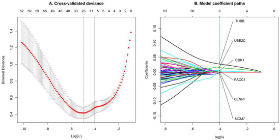This study adjusts for starting a variable selection with a large number of features by validation followed by training. Therefore, 147 candidate model genes were used to fit the LASSO regression model, and 10-fold cross-validation was used to train the model. According to lambda 1se, 0.03422616 was determined as an appropriate λ value (Figure 9A). Finally, six non-zero coefficient TNBC genes (CDK1, CENPF, MCM7, PACC1, TUBB, and UBE2C) were obtained (Figure 9B), which were then used in survival analysis to verify the prognostic value.