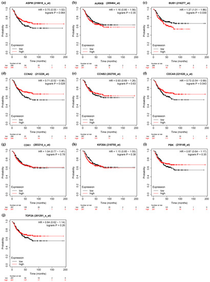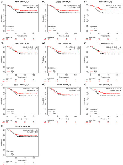 Overall survival (OS) analysis of 10 hub genes in TNBC patients by KM Plotter. (n = 201) (a) ASPM (b) AURKB (c) BUB1 (d) CCNA2 (e) CCNB2 (f) CDCA8 (g) CDK1 (h) KIF20A (i) PBK (j) TOP2A.