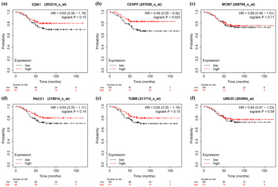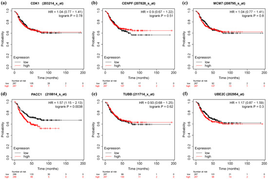 Overall survival (OS) analysis of 6 Significant genes in TNBC patients by KM Plotter. (n = 201) (a) CDK1 (b) CENPF (c) MCM7 (d) PACC1 (e) TUBB (f) UBE2C.