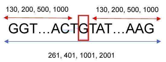 All the genetic sequences for H. sapiens, M. musculus, D. rerio, D. melanogaster, A. thaliana, and C. elegans were obtained from Ensembl (https://www.ensembl.org, accessed on 1 August 2021). For the human genetic sequences, 19,305 gene sequences, with their annotation information (description, strands, starting and ending points, IDs, donor and acceptor sites’ positions) were downloaded using the gene names obtained from the GENCODE V24lift37 gene annotation table from the UCSC table browser []. For the other species’ genetic sequences, between 15 and 40 genes were downloaded. The gene names were randomly selected from the same annotation table used for the human genome. To gather more information located upstream and downstream from each splice site, a fixed length of neighboring nucleotides from each nucleotide of interest was considered. For this research, 130, 200, 500, and 1000 base pairs situated left and right from a specific nucleotide were studied; therefore, the length of the sequences that were introduced into the neural networks were 261, 401, 1001, and 2001, respectively, as shown in Figure 1. Based on the neural network architecture described in the following section, 130 neighboring nucleotides on each side were the minimum input needed to construct a viable neural network considering the max-pooling layers, the number of filters, and their widths.