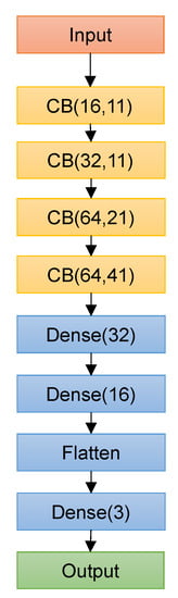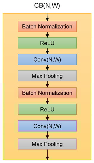 The Convolutional Block (CB) structure contains Batch Normalization, ReLu, Convolutional (Conv), and Max Pooling layers.