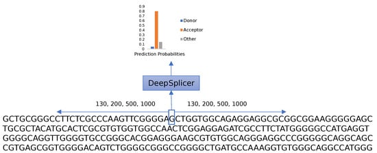 The research aims to differentiate between donor, acceptor, and other generic nucleotides in a genomic sequence. As shown in Figure 4, given a genomic sequence, the prediction process iterates through each of the nucleotides of the sequence, taking neighboring nucleotides located upstream and downstream from the nucleotide of interest into consideration. The complete sequence is one-hot-encoded and processed using Deep Splicer, which predicts the class that the nucleotide belongs to.